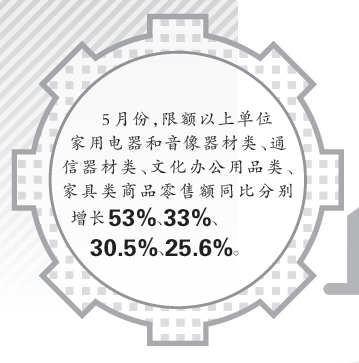 除电动自行车外,手机、平板电脑等数码产品同样销售火热。5月份,限额以上单位家用电器和音像器材类、通信器材类、文化办公用品类、家具类商品零售额同比分别增长53%、33%、30.5%、25.6%,合计拉动社会消费品零售总额增长1.9个百分点,比上月提高0.5个百分点。