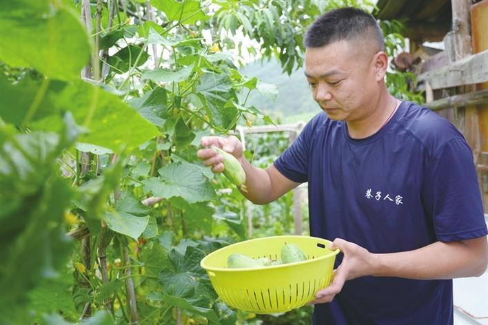 农家乐负责人张立在蔬菜基地采摘黄瓜招待游客。 记者 杨春艳 摄