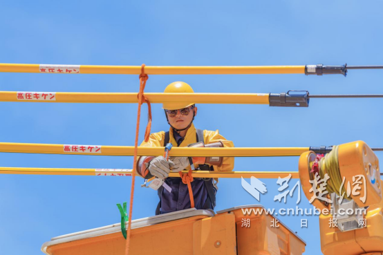 7月3日中午12时,在武汉市蔡甸区玉贤街道附近,国网武汉供电公司输电运检分公司工作人员王继杨、厉建昊登上220千伏玉梧线2号塔,以不断电“带电作业”的方式安装分流线,处理导线节点发热。经过全程45分钟的紧张抢修,节点温度从90℃降至44℃,意味着风险解除。