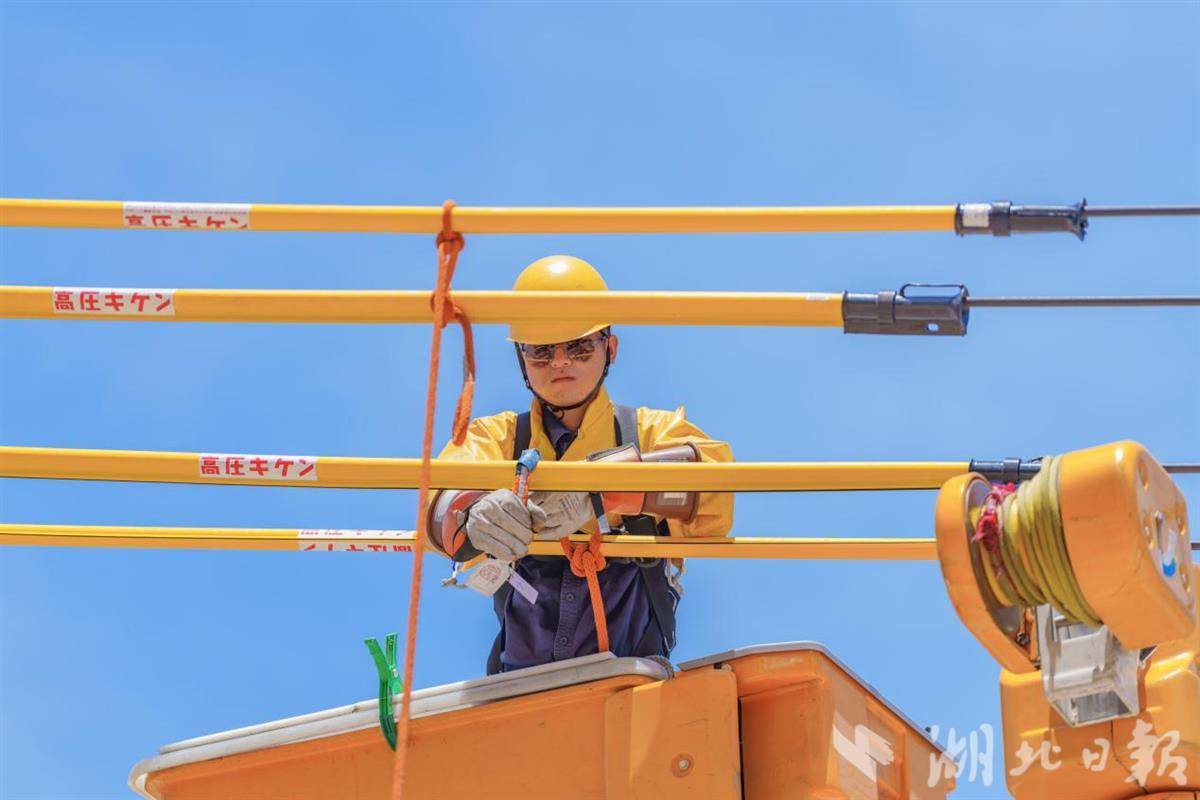 7月3日中午12时,在武汉市蔡甸区玉贤街道附近,国网武汉供电公司输电运检分公司工作人员王继杨、厉建昊登上220千伏玉梧线2号塔,以不断电“带电作业”的方式安装分流线,处理导线节点发热。经过全程45分钟的紧张抢修,节点温度从90℃降至44℃,意味着风险解除。