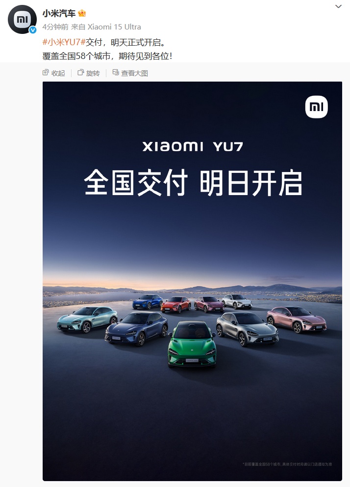 7月5日下午,小米汽车发文称小米YU7交付,将于明天正式开启。覆盖全国58个城市,期待见到各位!