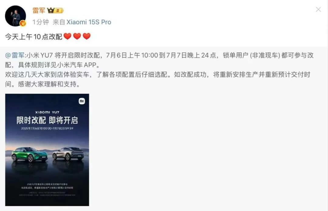 雷军刚刚发文,小米YU7今天上午10点改配。