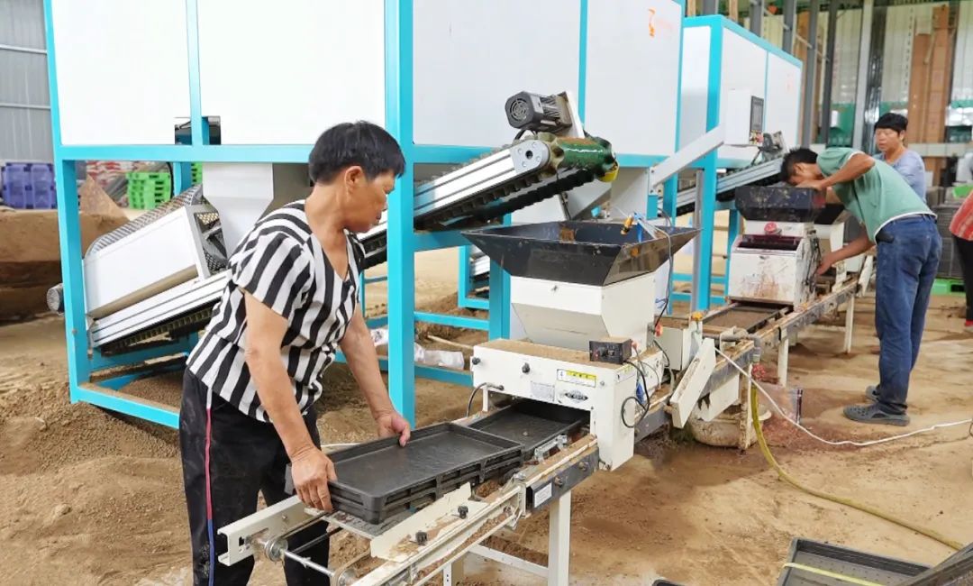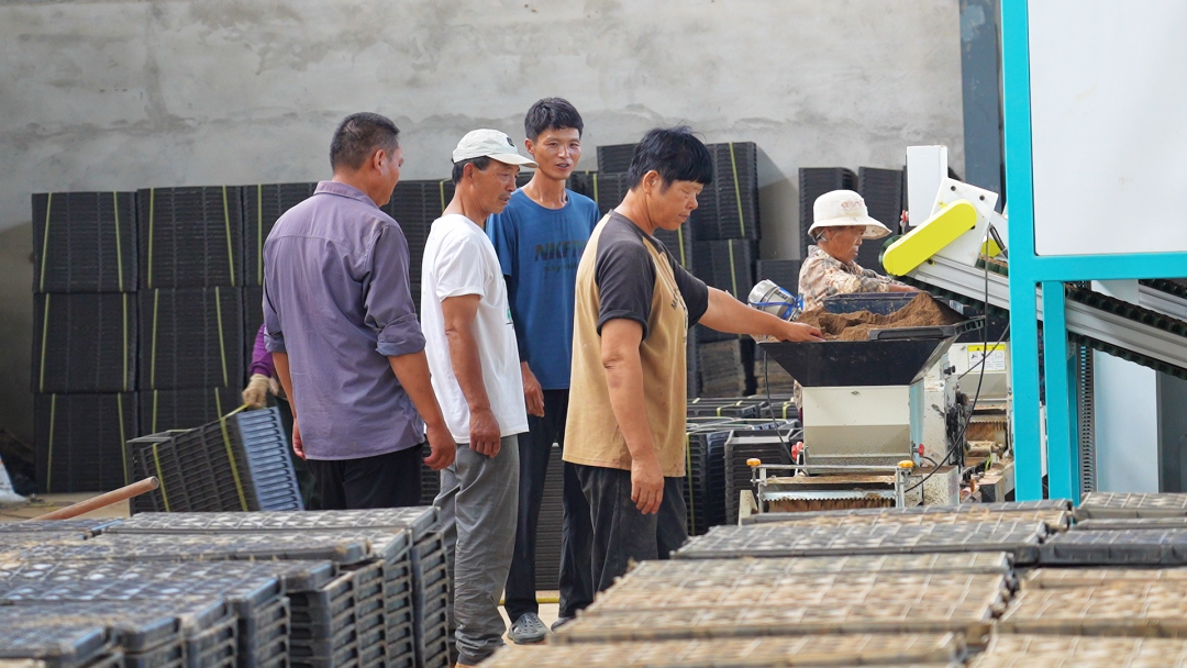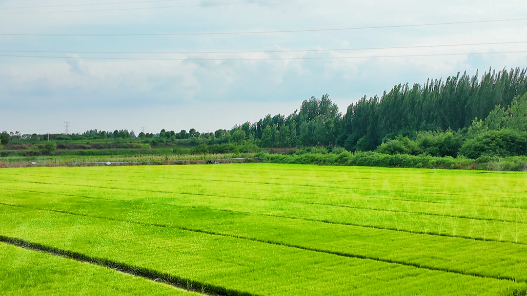 在孝昌县邹岗镇双鹏家庭农场,一盘盘秧苗整齐排列,叶色鲜绿、根系发达,农场负责人付鹏程正带着农户现场查看太子稻的育秧情况。
