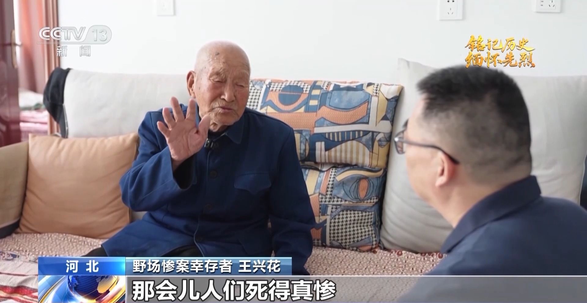 野场惨案幸存者 王兴花:那会儿人们死得真惨。日军头一次问,八路军东西在哪儿,都说不知道,第二次还问还是这一套,第三次日军说,说了你们就能活,要不说统统开枪灭掉你们,王璞站起来说不知道,大家伙一致说不知道。