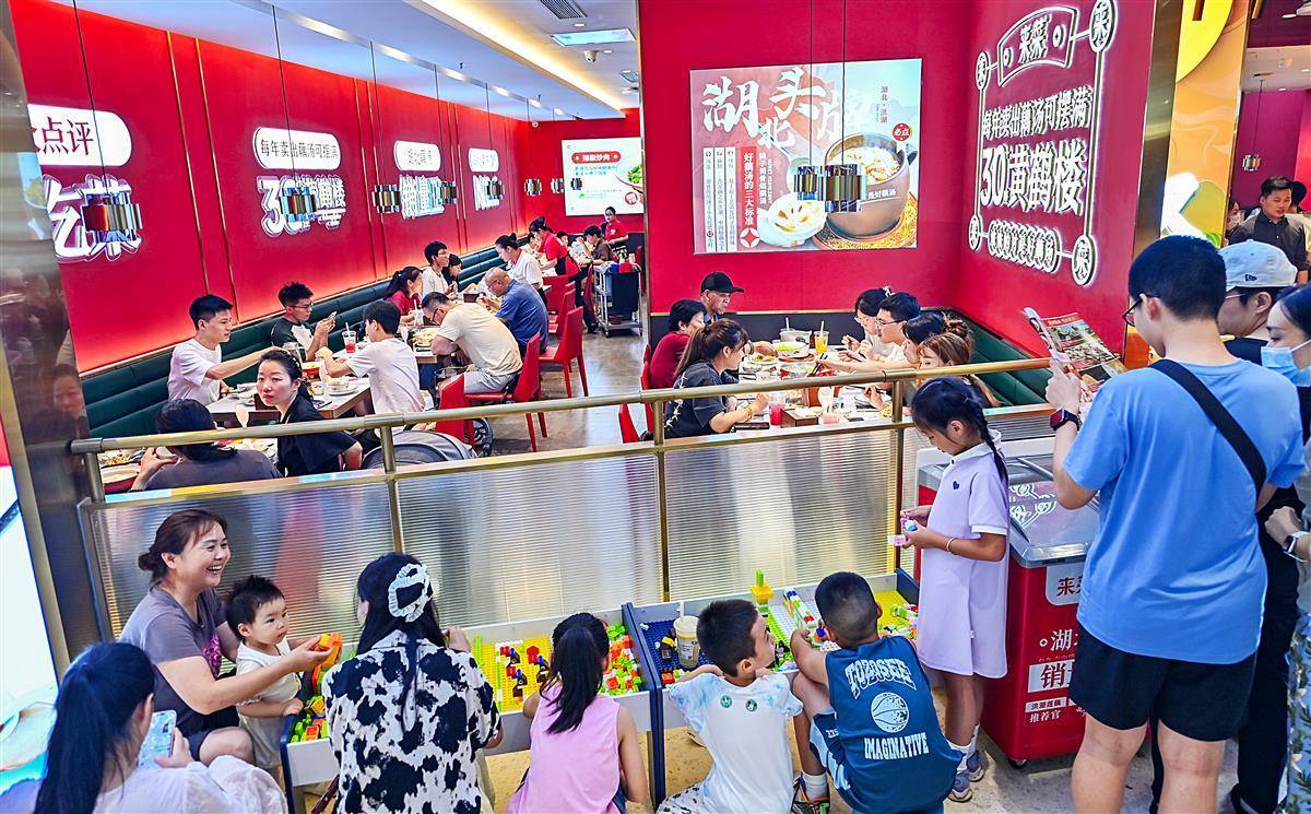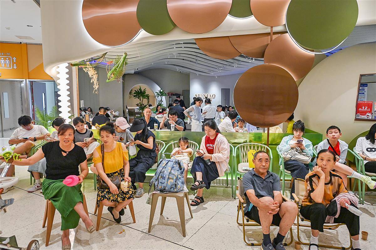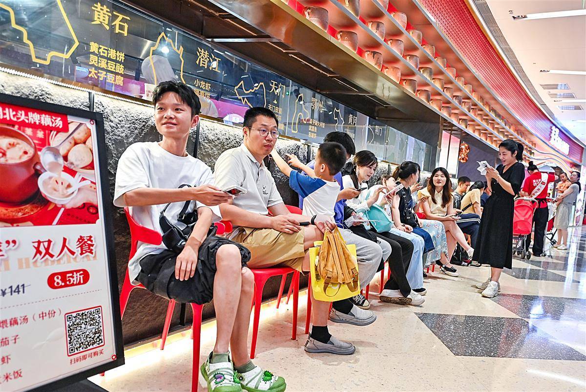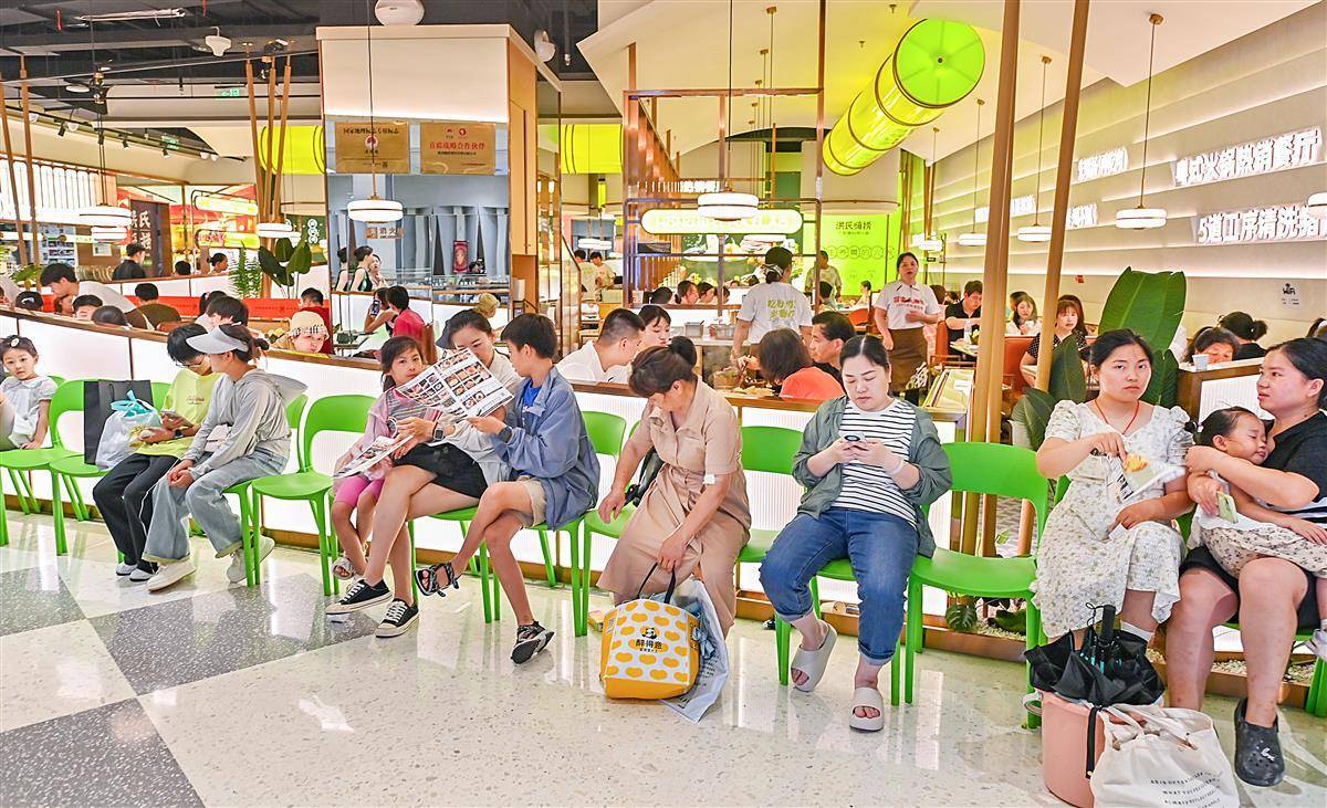 7月5日14时,记者在武商梦时代看到,商场里人来人往,特别是餐饮区还有许多消费者在排队等待叫号进餐。