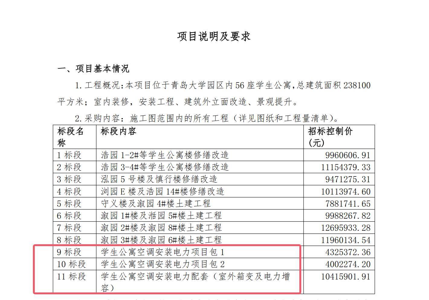 在今年5月底及6月底,青岛大学先后发布学生公寓维修改造项目招标公告、学生公寓维修改造项目(1676)竞争性磋商公告,上述内容均提及学生公寓空调安装电力项目和学生公寓空调安装电力配套(室外箱变及电力增容)。