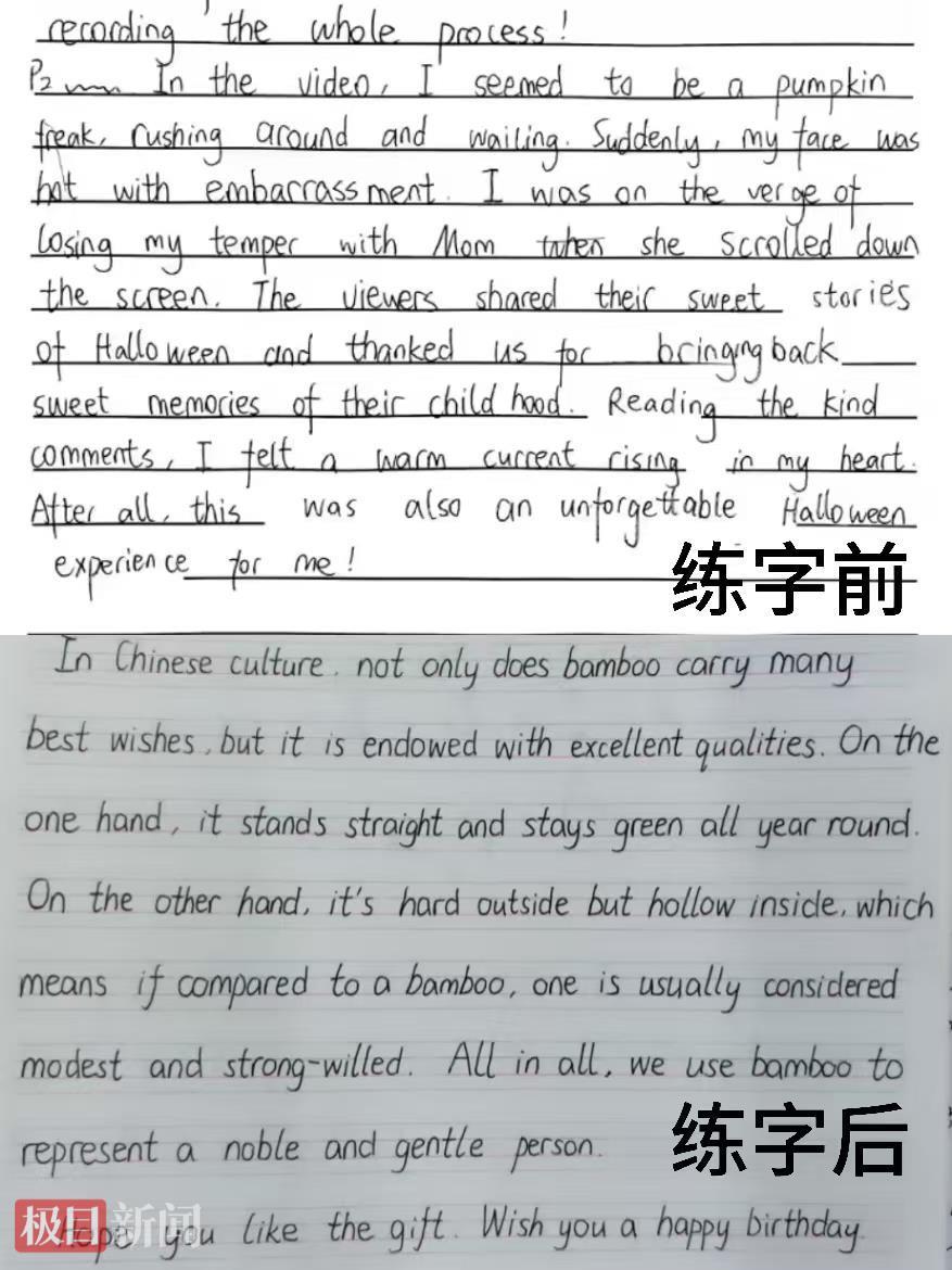 “早期他的字体一言难尽,像‘蚂蚁体’,感觉发育不良。”赵丽萍吐槽道。为了帮助何天瑞等书写不够规范的同学,在高考中避免不必要的失分,班主任李鹏建了一个“英语练字打卡群”,几位同学每天上传练习衡水字体的成果,再由英语组老师轮流点评指导。何天瑞在群里从去年10月坚持打卡到高考前夕,整整8个月几乎一天不落,字迹有了明显进步。