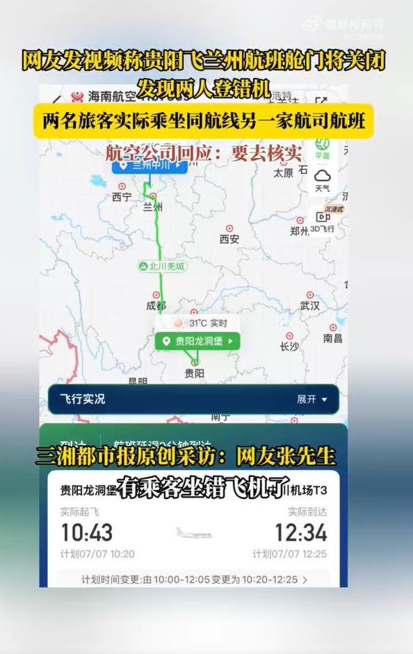 近日,一网友发布视频称,从贵阳龙洞堡机场飞往兰州中川机场的海南航空HU7359次航班,即将关闭舱门之际,突然被告知有乘客上错了飞机,引发网络关注。