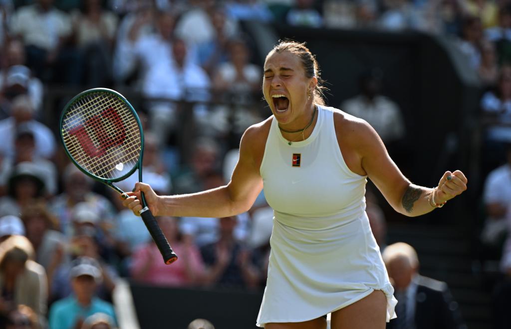 7月8日,萨巴伦卡在比赛后庆祝胜利。新华社记者 李颖 摄