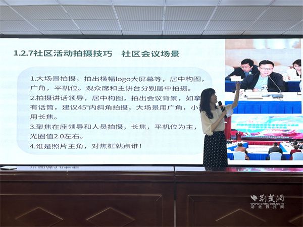 “社区活动拍摄的核心是什么?”讲师以问题切入,从活动筹备阶段的场景预判,到景别选择、构图布局、光线运用等实操技巧,系统讲解如何用影像讲好社区故事。“一张有温度的照片,能比语言更易引发居民共鸣。”讲师特别强调,社区会议的细节捕捉、服务场景的真情瞬间,都是展现治理温度的关键。