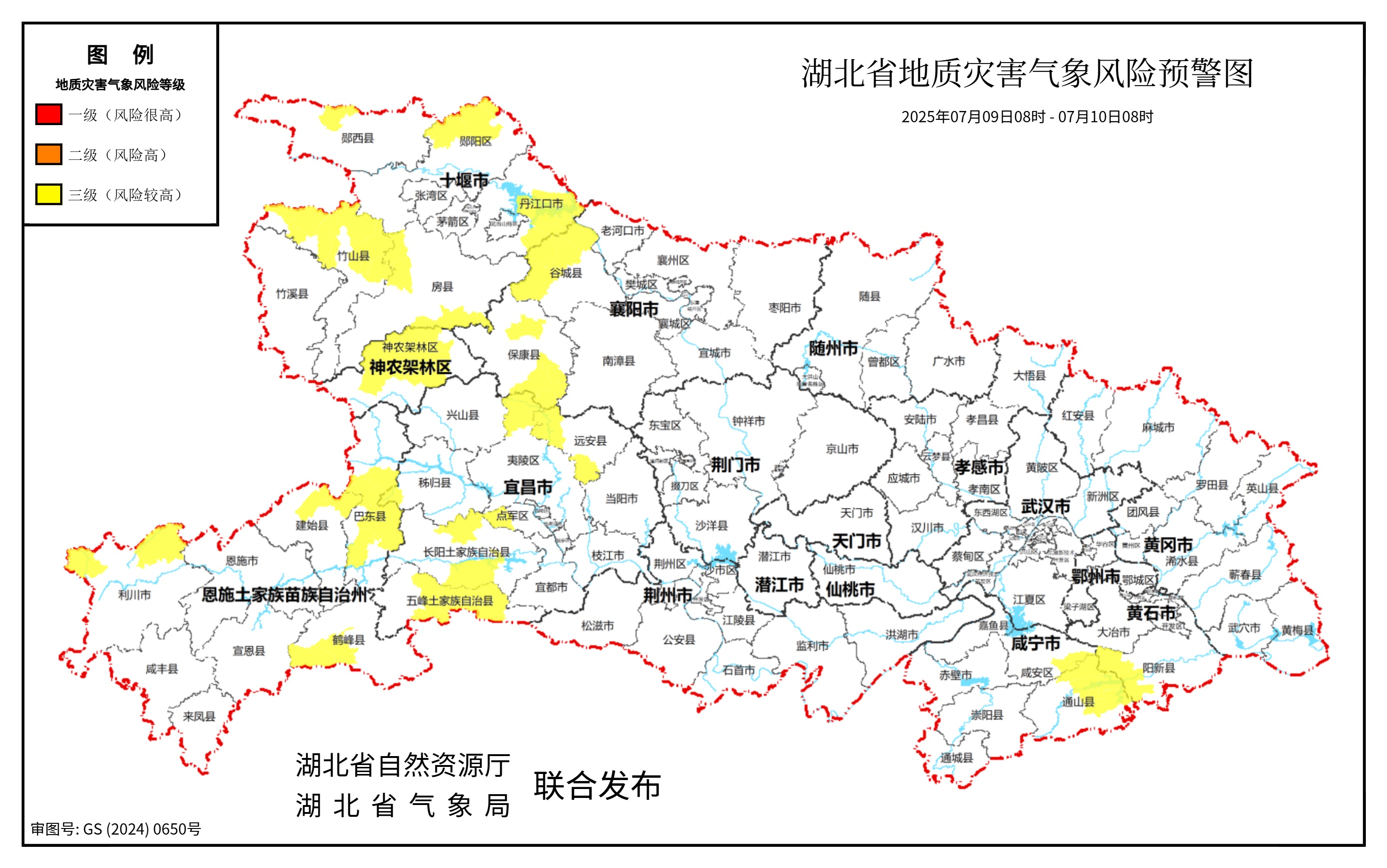 湖北日报讯(记者刘胜)7月9日,省自然资源厅、省气象局联合发布地质灾害风险预警。2025年07月09日08时-2025年07月10日08时,预计三峡库区(巴东县中部、秭归县西南部),神农架林区中部、十堰(郧阳区北部、郧西县中北部、竹山县北部、房县西北部和南部、丹江口市中部和东部)、襄阳(谷城县北部和西部、保康县中部和南部)、宜昌(点军区、夷陵区北部、远安县西北部和南部、长阳土家族自治县中北部和中南部、五峰土家族自治县中部)、恩施(建始县北部、利川市北部、鹤峰县西南部)、咸宁(咸安区东南部、通山县北部和东部)、黄石(阳新县西部) 以及其他强降水区域发生崩塌、滑坡、泥石流的风险较高。