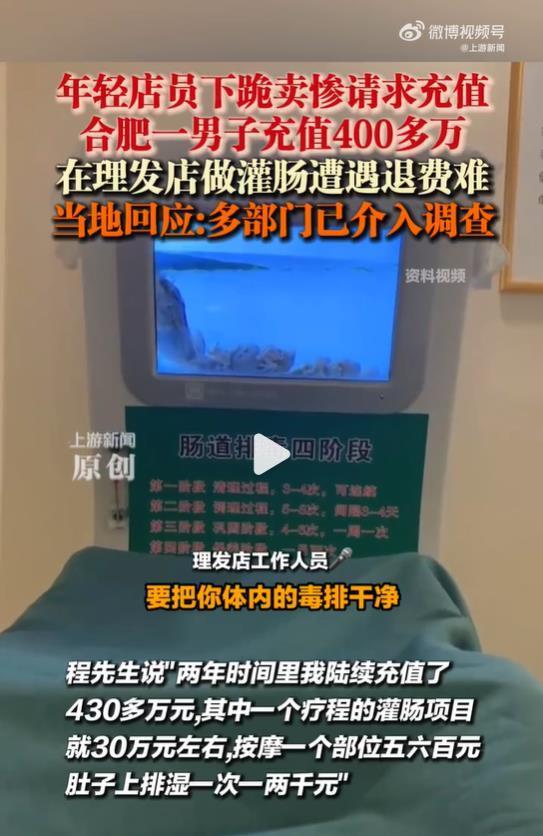 为了给朋友捧场,程先生称在合肥一家理发店2年内充值了430多万元,多次进行灌肠、针刺排毒后出现了身体不适。程先生查询发现该理发店并不具备行医资格,向门店索要剩余款项遭到拒绝。