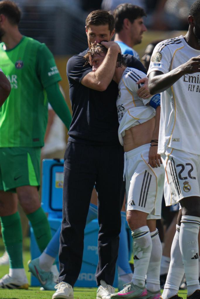 皇马队主教练阿隆索(左)赛后拥抱球员莫德里奇。这是莫德里奇效力皇马的最后一场比赛。新华社记者 黄宗治 摄