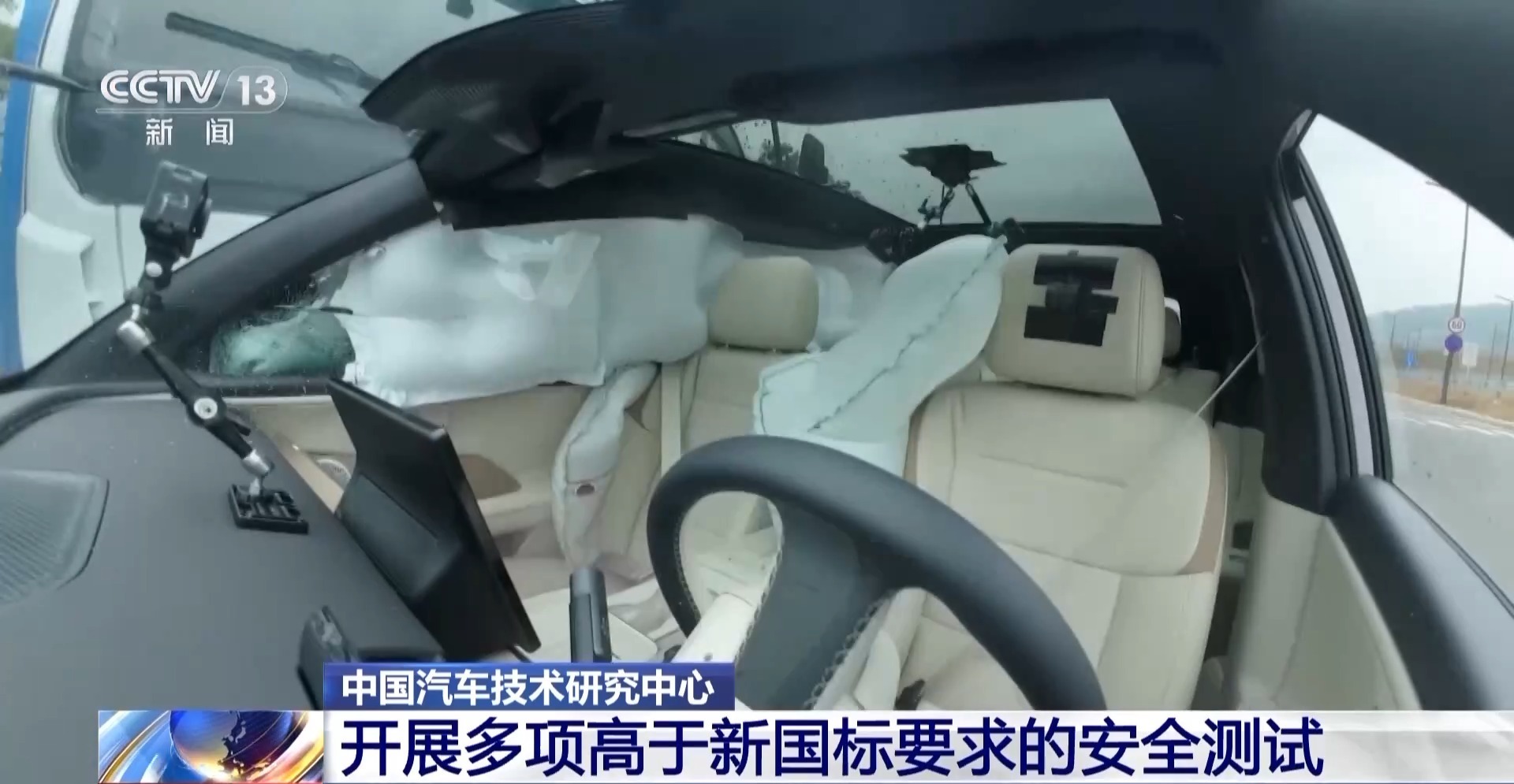 在中国汽车技术研究中心,记者看到,试验车辆以高于新国标2倍的速度,每小时100公里的时速侧面碰撞被测试车辆。这项安全测试重点考核车辆的电池包结构稳定,要求电安全系统不起火、不爆炸、无泄漏。