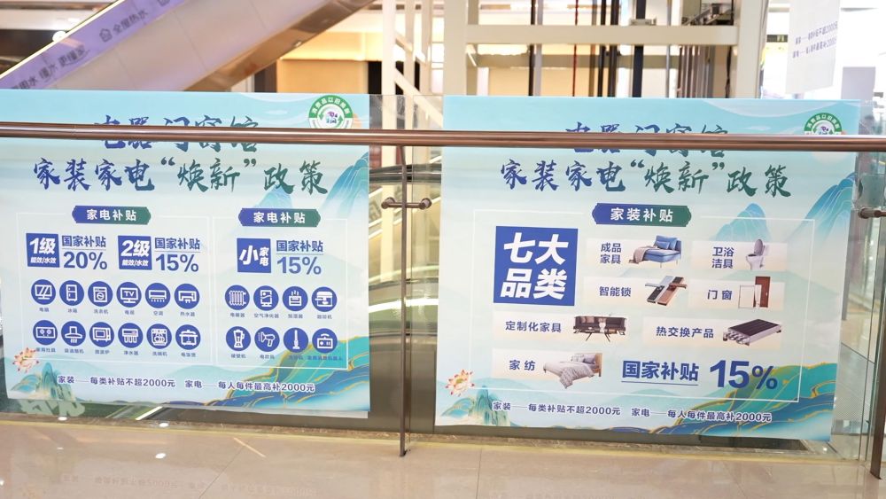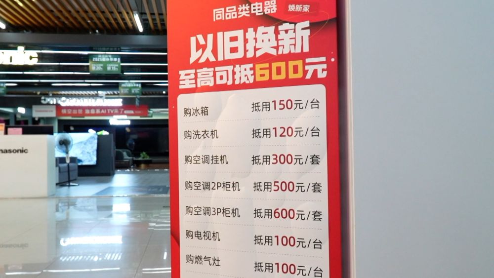 在位于河北保定高新区的红星美凯龙商场,以旧换新宣传牌格外醒目,优惠细则、补贴额度一目了然,家居家电卖场掀起消费热潮。