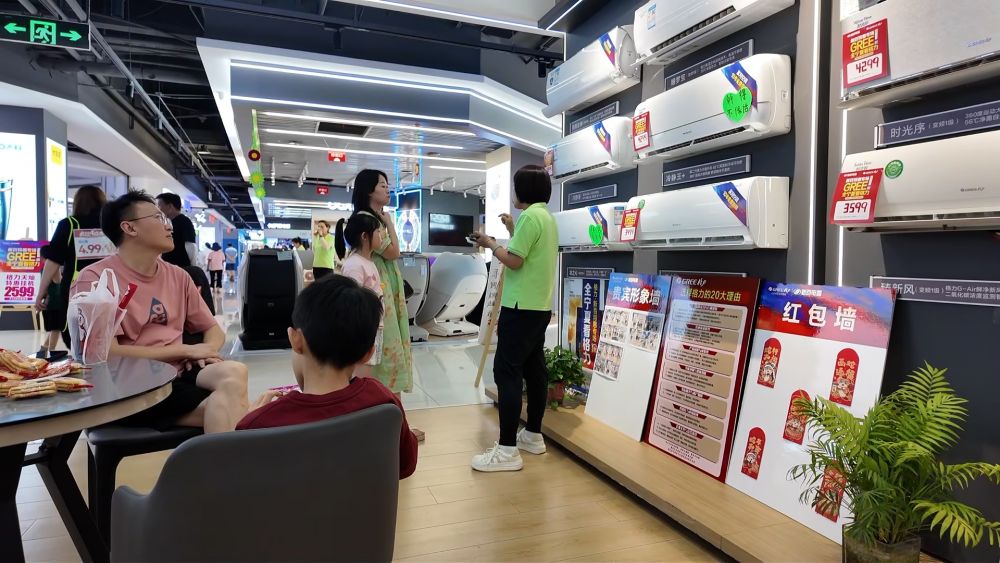 位于浙江湖州的浙北家电正在举办空调节和数码节,政府补贴和店内补贴的各类标语随处可见,吸引了许多消费者前来。