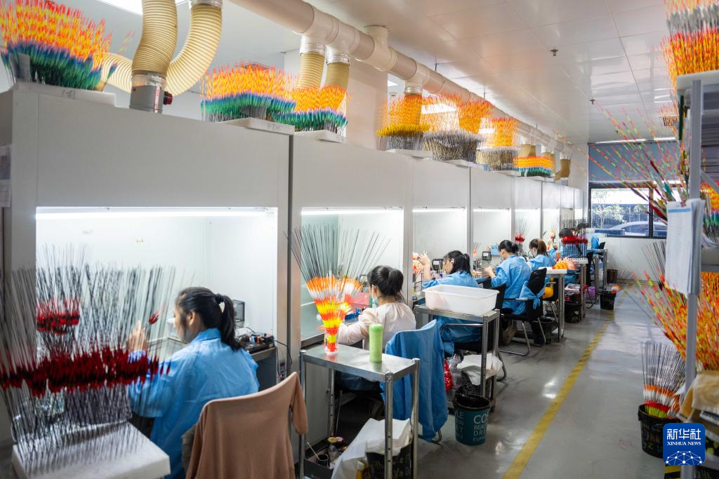 7月1日,在湖南临湘浮标特色小镇的临湘民间艺人钓具有限公司生产车间,工人在生产浮标。 新华社记者 陈思汗 摄