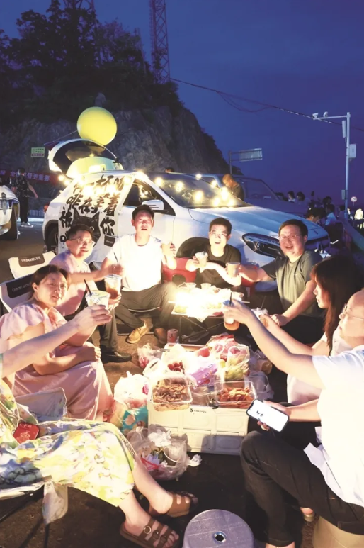 在龙脖垭的路口拐角处,李建军把老式冰棒箱搬上了山,“绿豆冰棒三块钱一根!”再往里些,糖画摊的王师傅正在熬糖,铜锅里的糖汁浇出龙凤的图案。张婆婆的射击游戏摊前围了好几个小朋友。旁边的卤菜摊旁,好几家人围坐了一圈又一圈……沿着山路向上徒步,户外郊游、露营烧烤、老友欢聚,不同的玩法在这里交融。