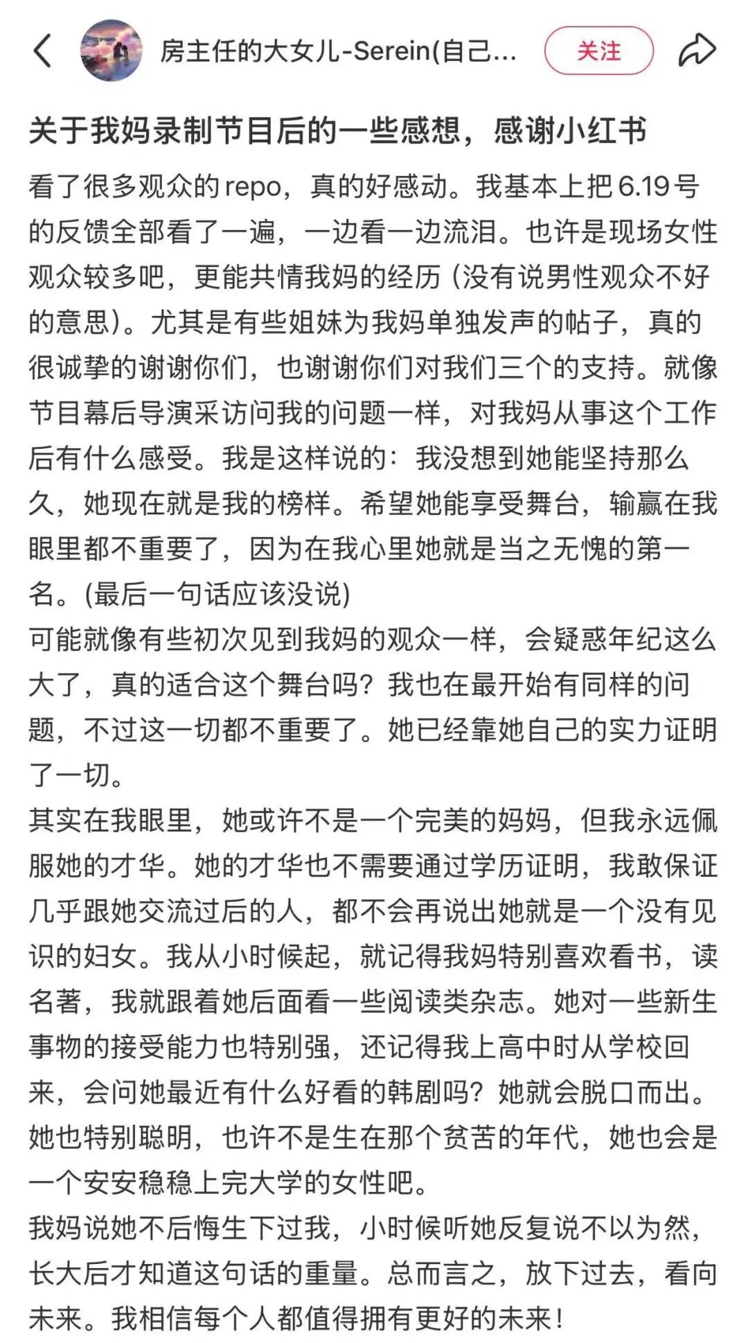 全网热议后,7月12日凌晨,房主任的大女儿在社交平台上发布了她关于妈妈录制节目之后的一些感想。她感谢大家对妈妈的支持,表示:“她现在就是我的榜样。”