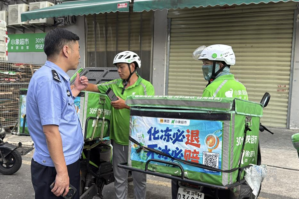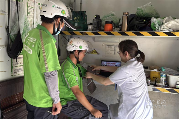 “师傅们快进来歇歇脚,喝杯酸梅汤解解暑!”工会志愿者和“两新”组织居然智家余家头店的工作人员向户外工作者发放解暑凉饮。外卖骑手张师傅接过酸梅汤一饮而尽,直呼“够地道、够解渴”。工会志愿者还为新就业群体送上包含藿香正气水、冰凉袖套、驱蚊花露水等“清凉礼包”,并叮嘱他们合理安排作息时间,做好高温防护。