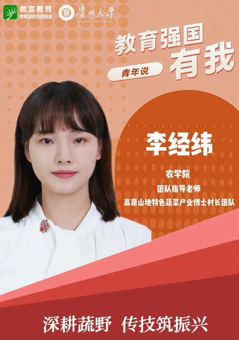 习近平总书记强调,希望广大青年坚定理想信念,厚植家国情怀,练就过硬本领,发扬奋斗精神,到祖国和人民最需要的地方发光发热,为中国式现代化建设贡献青春力量。教育强国建设,青年何为?教育部政务新媒体推出“教育强国,有我!”网络主题宣传活动之“青年说(报国篇)”系列,展现青年学子将个人理想融入国家发展的青春担当。今天,跟教育小微通过1个视频和1组海报,一起来看贵州大学的“博士村长”如何助力乡村振兴——