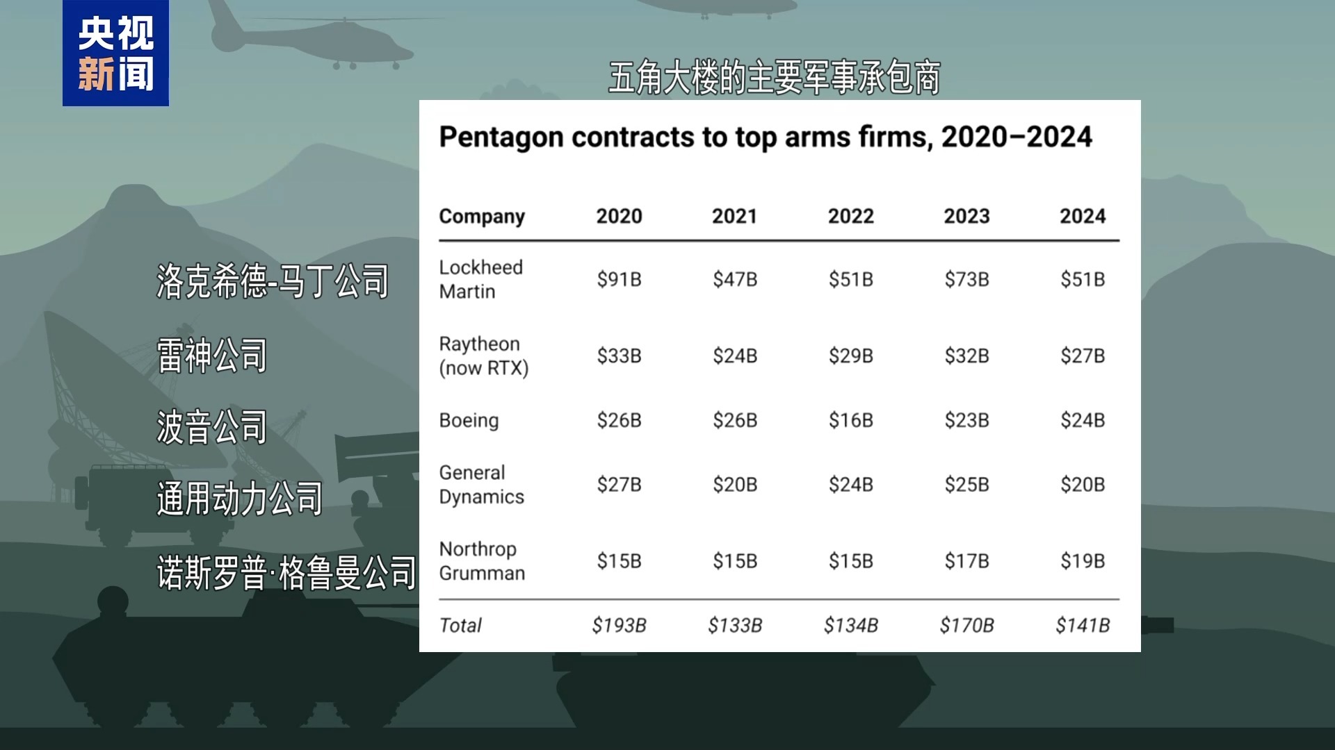 昆西治国方略研究所和布朗大学“战争成本核算”项目近期发布的一份报告称,从2020年到2024年的五年间,五角大楼54%的可自由支配开支,也就是2.4万亿美元都流向了私营公司。其中7710亿美元合同流向了五大军工巨头,包括洛克希德-马丁公司、雷神公司、波音公司、通用动力公司和诺斯罗普·格鲁曼公司。而美国政府的最新五角大楼预算将使美国每年的军费超过1万亿美元。