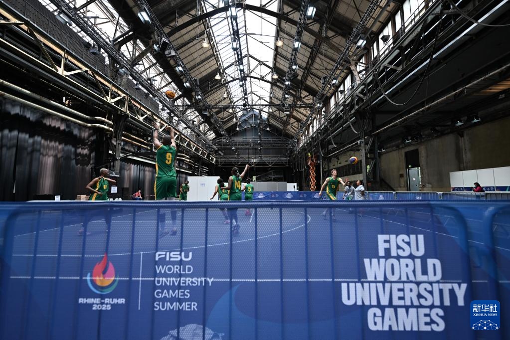 7月15日,在德国波鸿,三人篮球运动员在世纪厅体育馆内进行赛前训练。新华社记者 连漪 摄