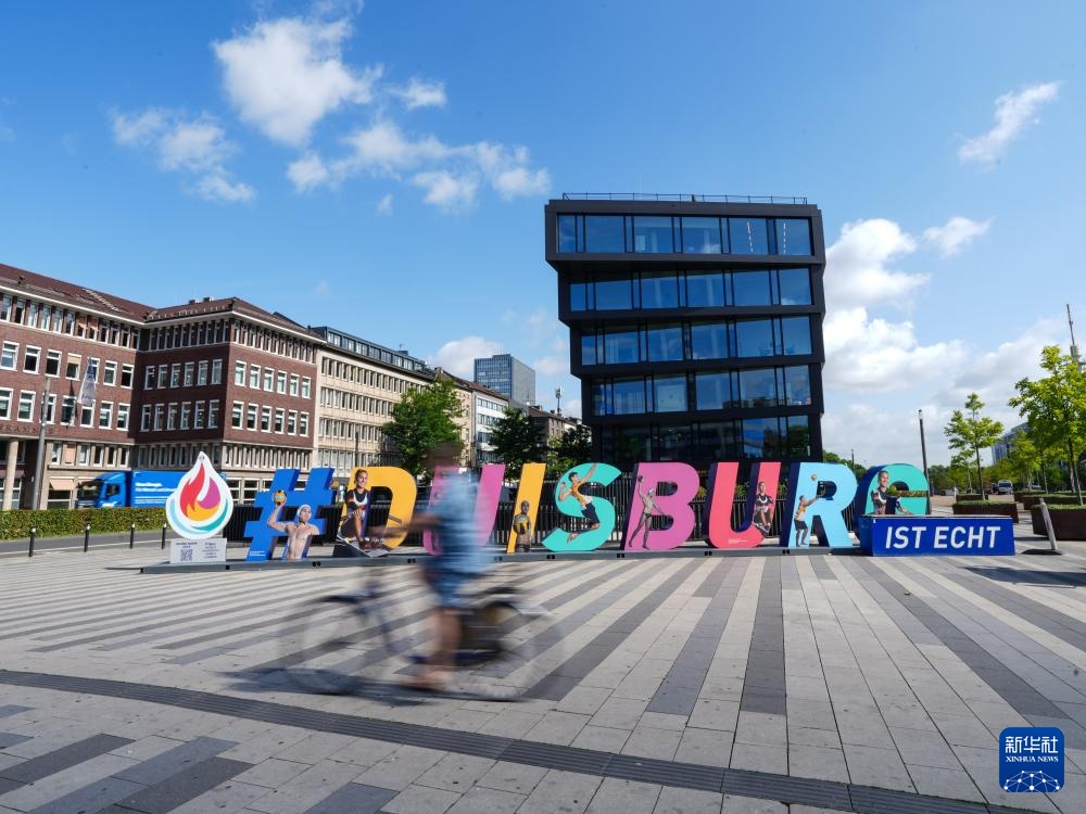 这是7月15日在德国杜伊斯堡内港拍摄的大运会宣传标识。新华社记者 王曦 摄