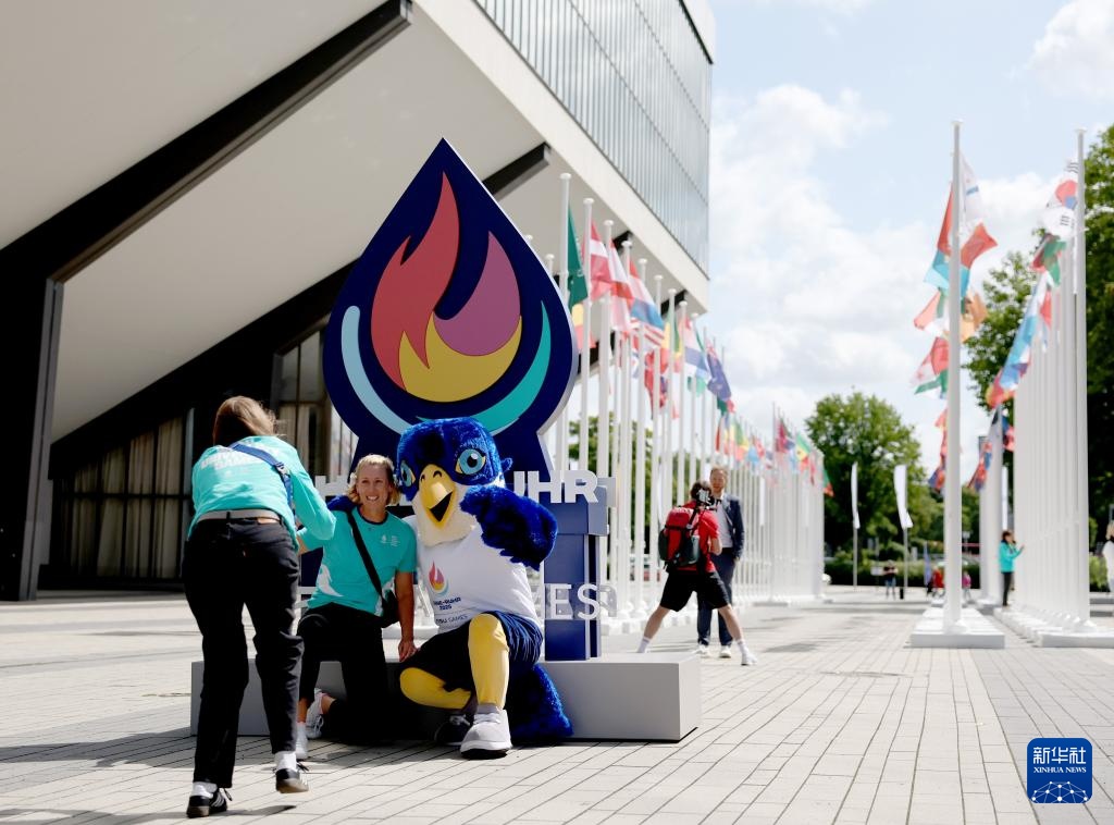 7月15日,在德国埃森,大运会吉祥物“Wanda”和本届大运会标志合影。新华社记者 张帆 摄