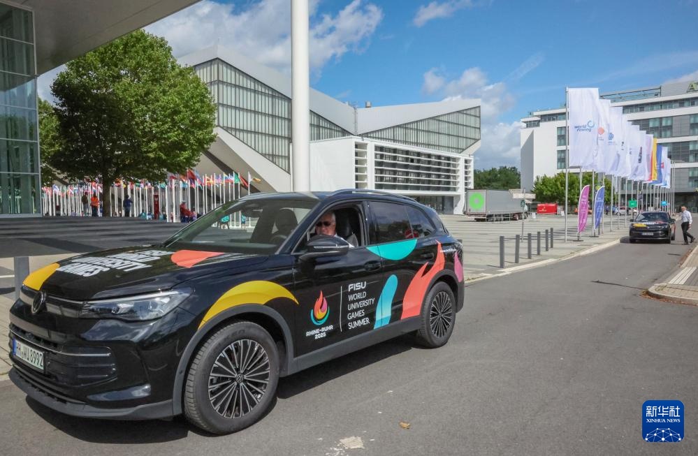 7月15日,在德国埃森,一辆大运会保障用车停在媒体中心门前。新华社记者 张帆 摄