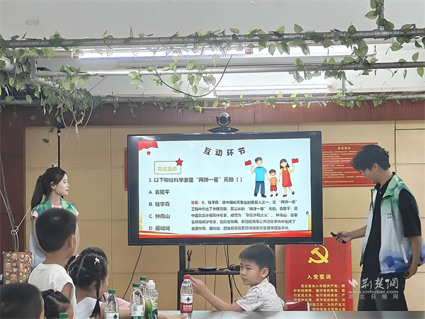 7月16日,读书社区新时代文明实践站里,湖北经济学院工商管理学院“核”光同尘志愿宣讲团带来“两弹一星”精神宣讲。宣讲团成员运用丰富的影像资料,讲述了钱学森、邓稼先等老一辈科学家在建国初期毅然放弃国外优渥条件,冲破重重阻力回到祖国,克服科研困境最终铸就“两弹一星”辉煌的感人故事。“科学词汇传声筒”互动游戏环节,孩子们在传递“原子弹”“卫星”等词汇的过程中,既学习了科学知识,更感悟到了科技工作者的爱国情怀。