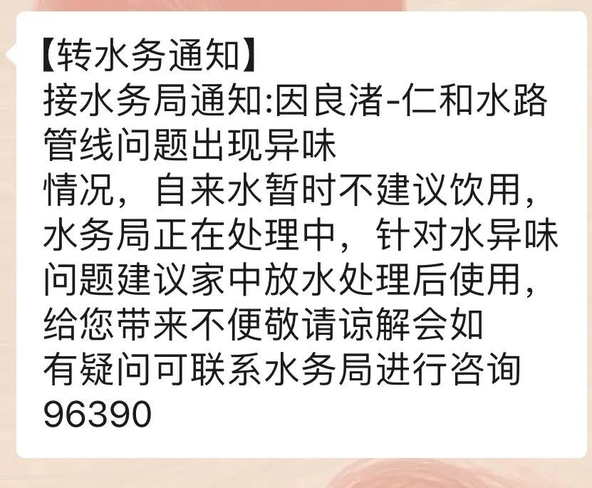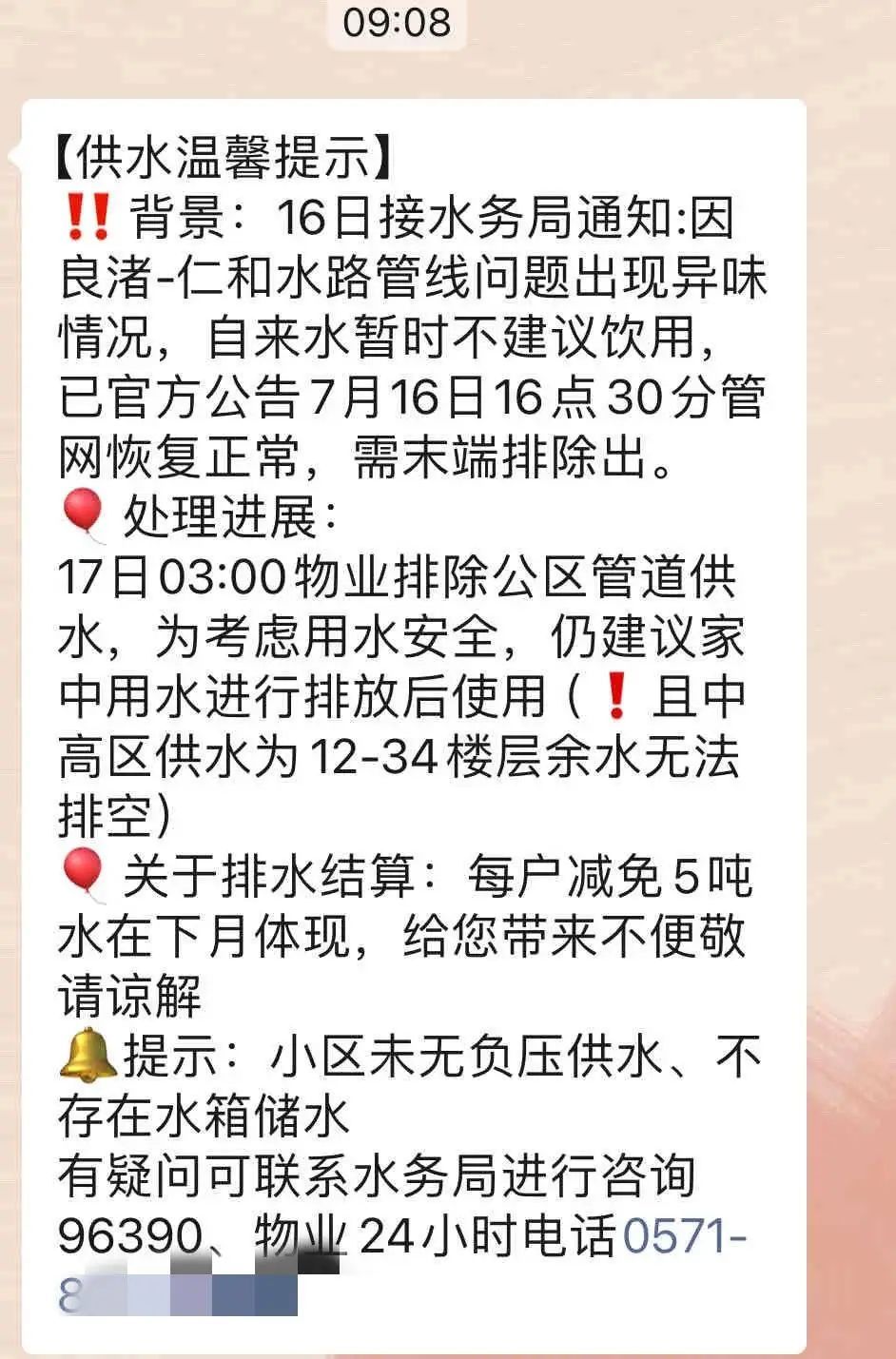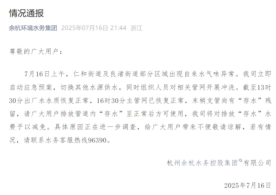 记者注意到,7月16日21时44分,余杭环境水务公众号发布了情况通报。通报中提到:“ 7月16日上午,仁和街道及良渚街道部分区域出现自来水气味异常。我司立即启动应急预案,切换其他水源供水,同时组织人员对相关管网开展冲洗。截至13时30分出厂水水质恢复正常,16时30分主管网已恢复正常,末梢支管尚有‘存水’残留,请广大用户排放管道内‘存水’至正常后方可使用,我司将对排放‘存水’水费予以减免。具体原因正在进一步调查。”
