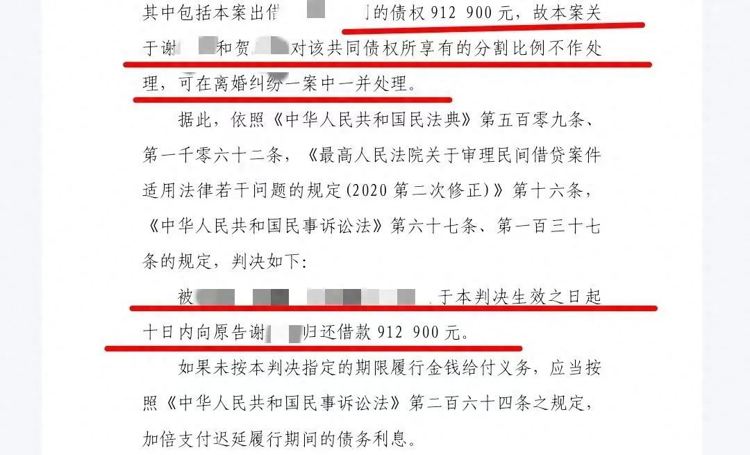 谢女士经后续调查发现,2023年1月5日至2023年4月26日期间,贺某阳用自己名下的银行陆续转账给其母亲所开公司,每笔转账金额均注“借款”“供支”,与该公司还款相互品迭(相抵)后,尚有912900元未归还。