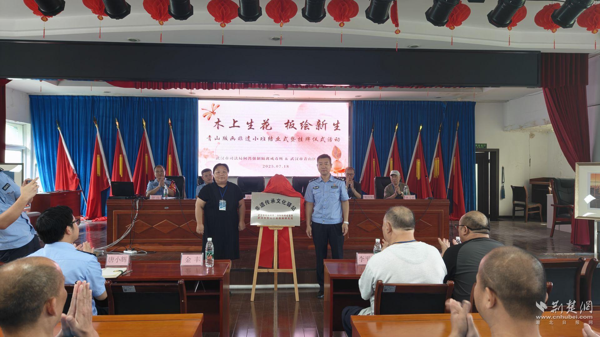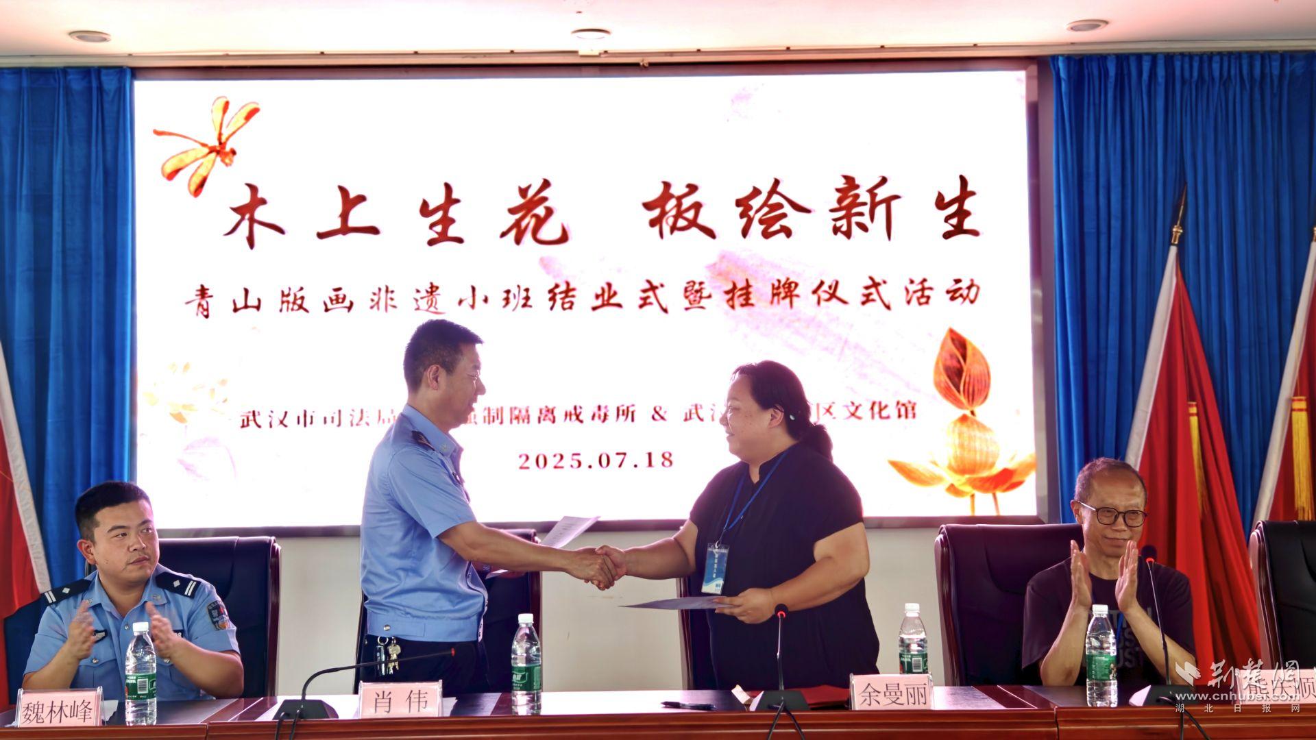 荆楚网(湖北日报网)讯(通讯员吕刚)为进一步探索“非遗助力戒毒矫治”模式新路径,7月18日,武汉市青山区文化馆(区非遗保护中心)主任余曼丽及青山区工业版画研究院院长熊庆顺等一行到武汉市司法局何湾强制隔离戒毒所,共同为戒毒人员“青山版画非遗小班”举行结业暨“非遗传承文化驿站”揭牌仪式。此次活动旨在展示非遗帮教成果,深化戒毒矫治工作与地方优秀传统文化的融合,为戒毒人员重塑信心、回归社会注入文化力量。