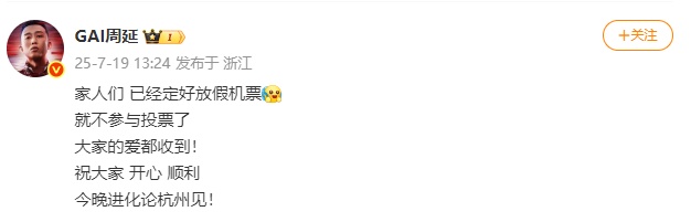 GAI周延也在社交平台发文称,“家人们,已经定好放假机票,就不参与投票了。”