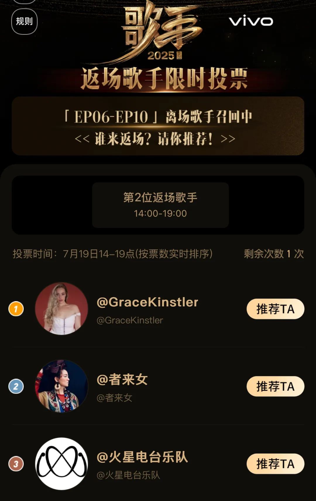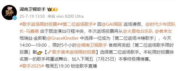 7月19日,据湖南卫视歌手官方微博,因GAI周延返场请假、时代少年团队长-马嘉祺由于既定演出行程冲突,本次返场投票将从火星电台乐队、者来女、格瑞丝·金斯勒中选择一位成为第二位返场冲榜歌手。