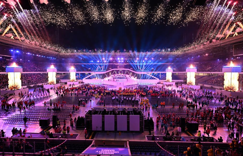 2023年8月8日,成都大运会举行闭幕式,时任国际大体联代理主席雷诺·艾德致辞。新华社记者 张龙 摄