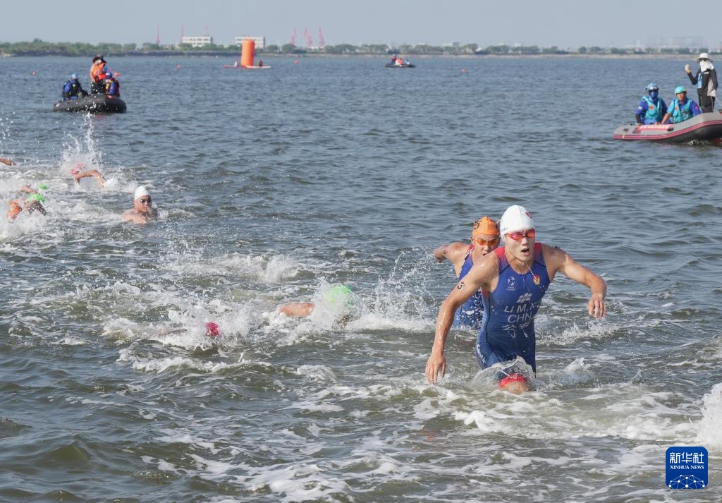 7月19日,中国公安体育协会铁人三项队选手李明旭(右一)在男子优秀组游泳比赛中。最终,他以56分52秒的成绩获得第二名。新华社记者 杨世尧 摄