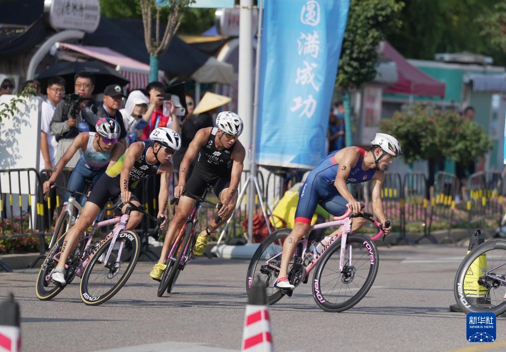 7月19日,广东铁人三项队选手黄立科在男子优秀组自行车比赛中。最终,他以57分09秒的成绩获得第三名。新华社记者 杨世尧 摄