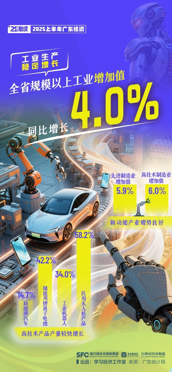 数据也佐证了这一判断。上半年,广东先进制造业、高技术制造业的规上工业增加值上半年分别同比增长5.9%、6.0%,占规上工业比重达55.4%、33.0%。高技术产品产量快速增长,新能源汽车、储能用锂离子电池、工业机器人、服务机器人、民用无人机产品产量分别增长14.7%、42.2%、34.0%、23.0%、58.2%。