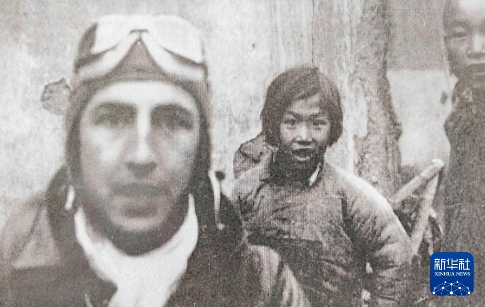 这是1942年4月,9岁的江西上饶广丰小女孩官冬香(中)站在美国飞行员身后。