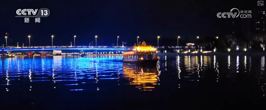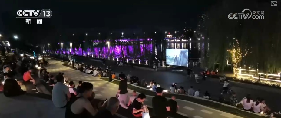 夜幕降临,大运河岸边灯光闪烁,夜间游船项目迎来了一拨拨游客。不仅能乘船,岸边免费的露天影院更是聚集了不少市民。大家坐在台阶上吹着晚风,观看露天荧幕,感受不一样的夏日浪漫。