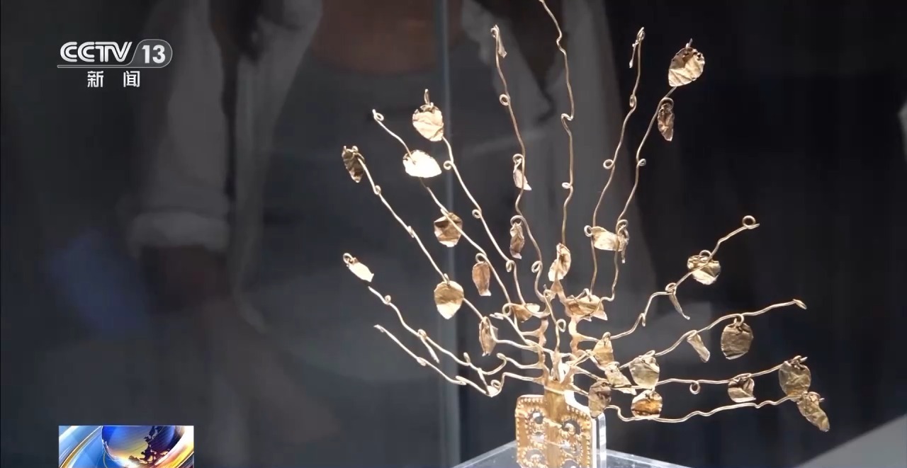 总台记者 杨雪:金光灿烂、摇曳生姿。很多游客在游览的过程当中,都情不自禁地用这8个字来形容我们看到的这款花树状金步摇,这款文物它出土于辽宁北票市的房身村,是三燕时期贵族当中非常流行的一种金质冠饰,距今已经有1700多年的历史了。