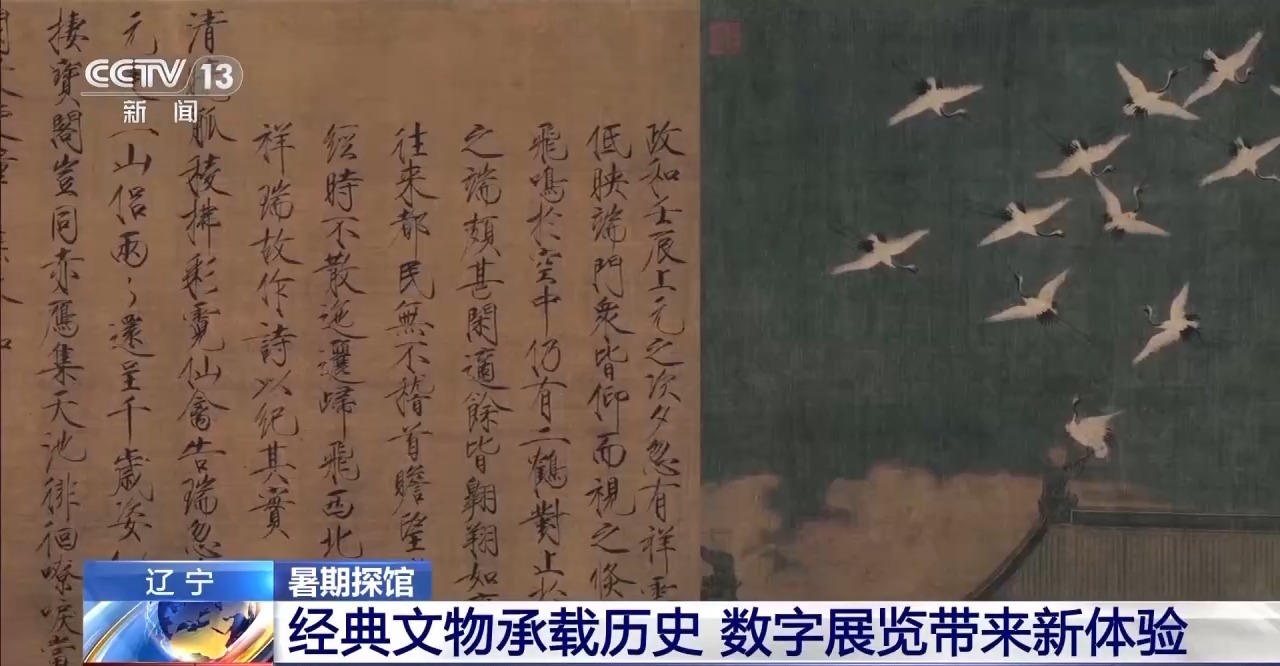 总台记者 杨雪:辽宁省博物馆收藏的历代书画在国内外的文物界都具有重要地位,但由于书画作品保存难度很大,不方便长期展出,为了让大家可以更加直观地感受中华传统文化的独特魅力,辽宁省博物馆打造出了这样一个全数字化的展厅,推出了名为“唐宋风华——数字画境中的艺术世界”的高科技沉浸式数字展览。这一展览以辽博珍藏的唐宋时期的国宝级传世名画为灵感来源,包括像我们大家非常熟悉的《洛神赋图》《瑞鹤图》等艺术瑰宝。在这个暑假当中,还会有风格不同的临时展览,其中最吸引大家的要数《山海有情·大漠鸣沙——在辽宁遇见敦煌》这个大型的主题展览了。