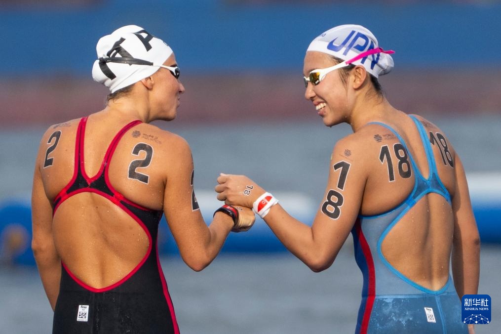 7月19日,日本选手梶本一花(右)和意大利选手塔代乌奇在比赛间隙交流,她们最终分获冠军、亚军。新华社记者 伍志尊 摄