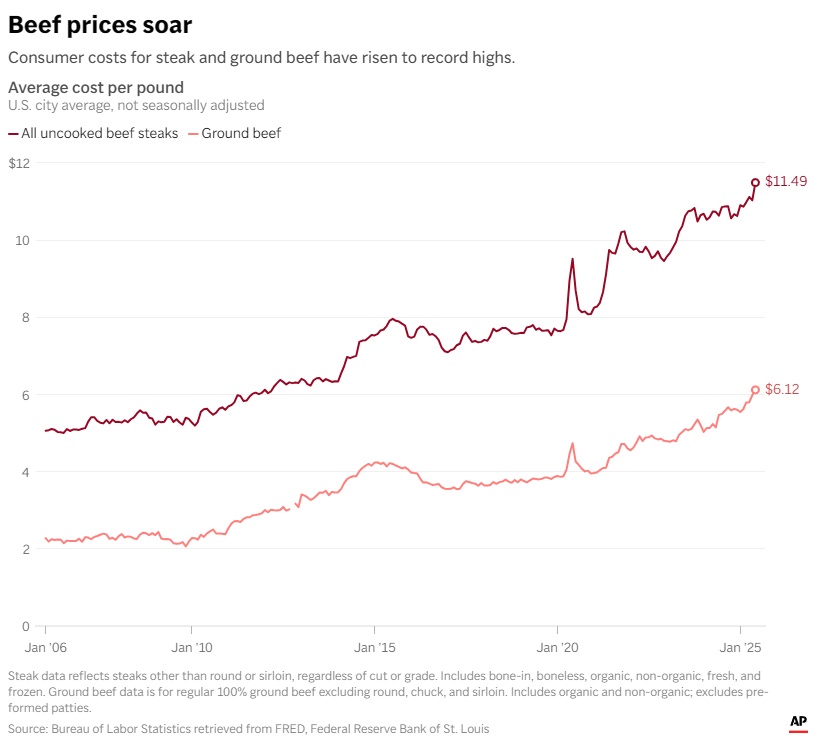 在过去的20年里,美国牛肉价格一直在稳步上涨,牛群数量几十年来则一直稳步下降。今年1月1日,美国有8670万头牛和小牛,这是自1951年以来最低的牛群数量。目前美国每年进口超过400万磅的牛肉,特朗普的关税政策可能会成为推动牛肉价格继续上涨的新因素。