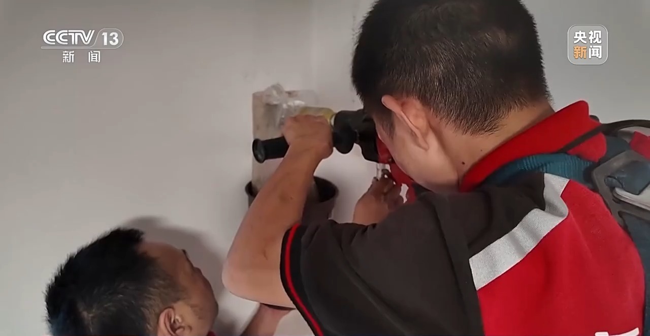 别看都是钻墙,但东北的墙由于有保温层,通常要比南方厚二三十厘米。而且混凝土的标号高、更坚硬,钻起来更费力。几十斤重的水钻,就这样一直举着,可不轻松。杨继乾和同事轮流上阵,光是打这个孔,就花了一个多小时。