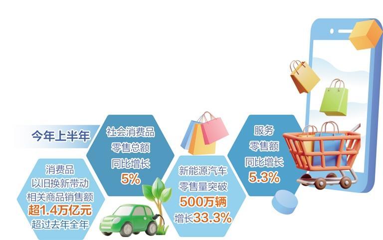 国家统计局贸易外经统计司司长于建勋表示,上半年,各地扩大补贴范围、简化流程、优化服务,扎实推进消费品以旧换新政策实施。数据显示,上半年,限额以上单位家用电器和音像器材类、文化办公用品类、通讯器材类、家具类商品零售额同比分别增长30.7%、25.4%、24.1%、22.9%。汽车销售明显改善。二季度,限额以上单位汽车类零售额同比增长2.3%,而一季度为下降0.8%。据汽车流通协会统计,上半年新能源汽车零售量突破500万辆,增长33.3%。