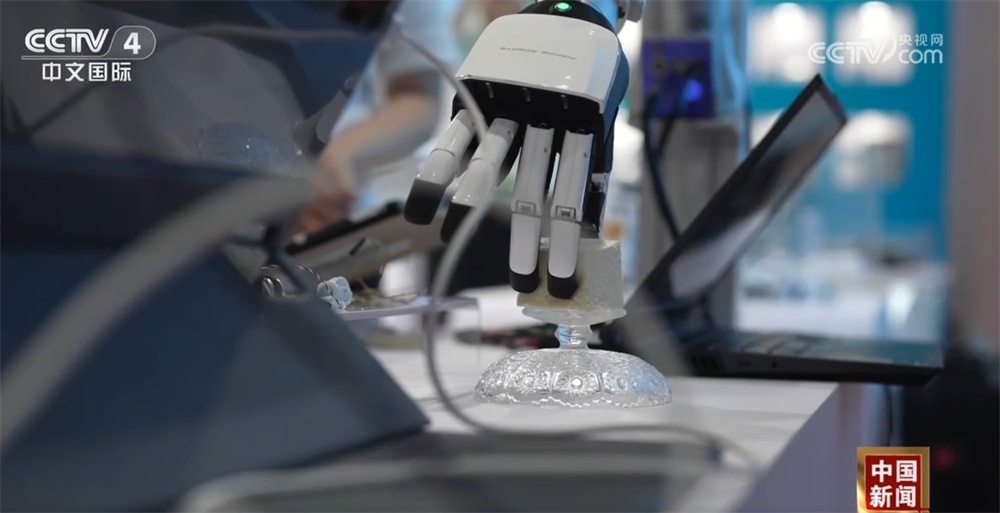 这个机器人的灵巧手,柔性电子皮肤上布满传感器,可以轻松“拿捏”一块豆腐。