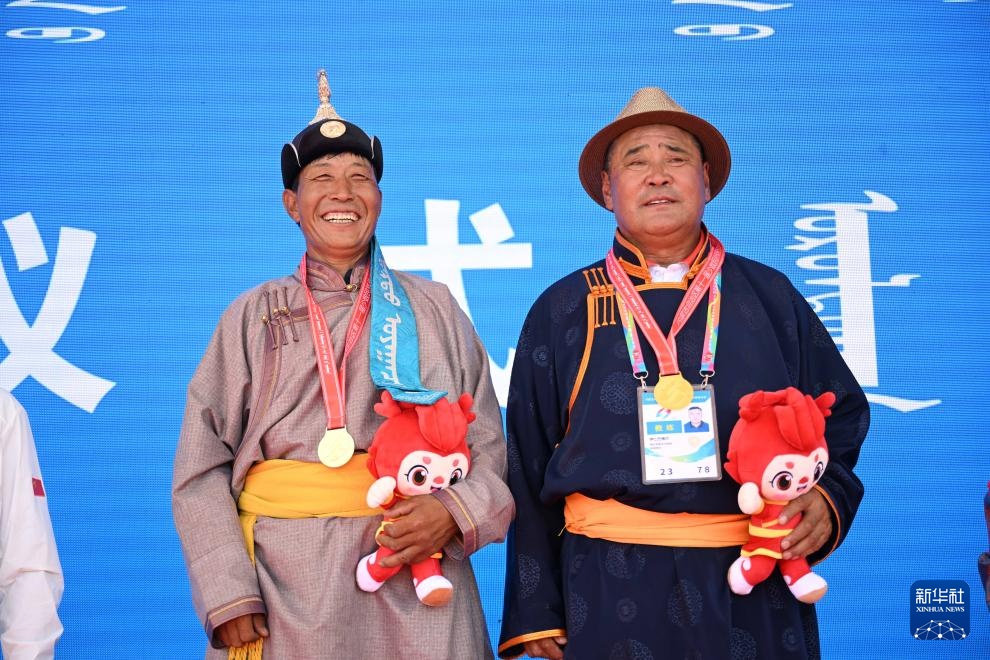 7月20日,一等奖获得者鄂尔多斯市代表队骑师扎斯格图(左)和教练在颁奖仪式上。